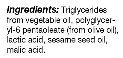 Triglycerides from vegetable oil, polyglyceryl-6 pentaoleate (from olive oil), lactic acid, sesame seed oil, malic acid.